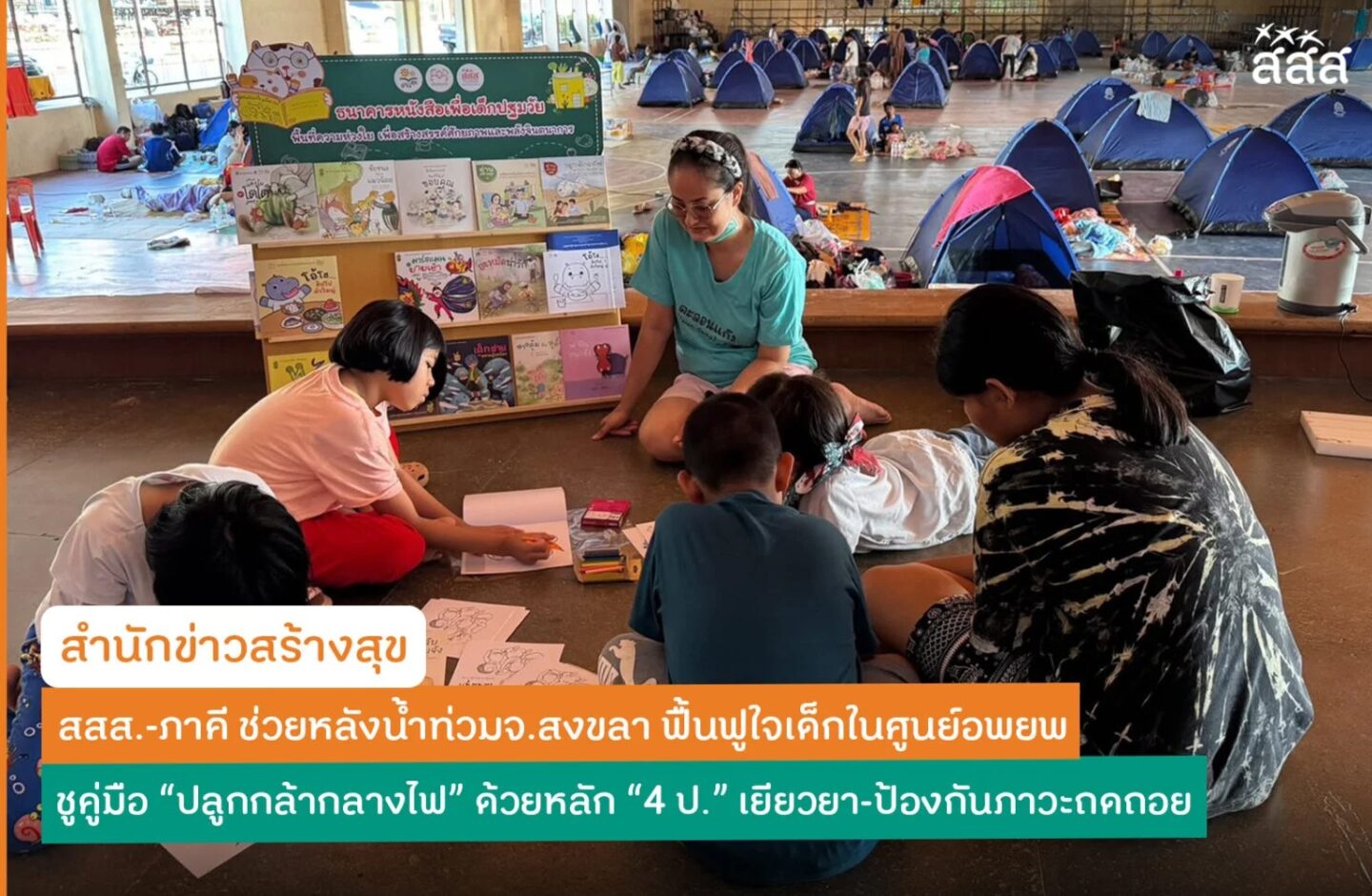 สสส.-ภาคี ช่วยหลังน้ำท่วม จ.สงขลา ฟื้นฟูใจเด็กในศูนย์อพยพ ชูคู่มือ “ปลูกกล้ากลางไฟ” ด้วยหลัก “4 ป.” เยียวยา-ป้องกันภาวะถดถอย