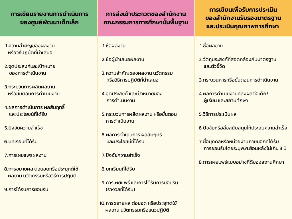 ในส่วนขององค์ประกอบของรายงาน Best Practice นั้น ในภาพรวมมีองค์ประกอบหลักที่สำคัญไม่แตกต่างกัน แต่ในรายละเอียดปลีกย่อยขึ้นอยู่กับวัตถุประสงค์ของการเขียนและหน่วยงานที่เกี่ยวข้อง เช่น เขียนเพื่อรายงานผลการดำเนินงานกับหน่วยงานต้นสังกัด เพื่อส่งเข้าประกวดแช่งขัน หรือเพื่อรับการประกันคุณภาพการศึกษา ซึ่งผู้เขียนต้องศึกษาองค์ประกอบของหน่วยงานที่เกี่ยวข้องและเขียนให้ถูกต้องตามรูปแบบ ในตารางที่ 1 ได้นำเสนอตัวอย่างองค์ประกอบของ 3 หน่วยงาน ในวัตถุประสงค์ที่ต่างกัน คือ การเขียนรายงานการดำเนินการของศูนย์พัฒนาเด็กเล็ก การส่งเข้าประกวดของสำนักงานคณะกรรมการการศึกษาขั้นพื้นฐาน การเขียนเพื่อรับการประเมินของสำนักงานรับรองมาตรฐานและประเมินคุณภาพการศึกษา ดังนี้