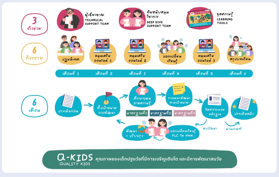 ซึ่งนวัตกรรมโปรแกรม 366 Q-KIDSเป็นเครื่องมือสนับสนุนการเรียนรู้ของครูและบุคลากร เพื่อให้ ศพด. ที่เข้าร่วมโครงการ สามารถดำเนินงานได้อย่างมีประสิทธิภาพ โดยอาศัย “3 ตัวช่วย” ได้แก่ 1. เครือข่าย ทีมผู้เชี่ยวชาญ 2.ทีมสนับสนุนวิชาการ และ 3. ชุดความรู้พร้อมใช้ ผ่าน 6 กิจกรรมหลัก ครอบคลุมทั้งด้านวิชาการและพัฒนาการเด็ก สอดคล้องกับมาตรฐานสถานพัฒนาเด็กปฐมวัยแห่งชาติ